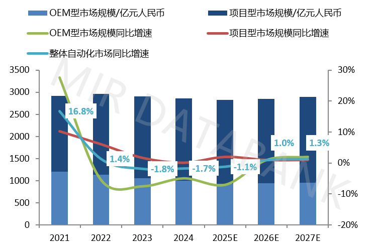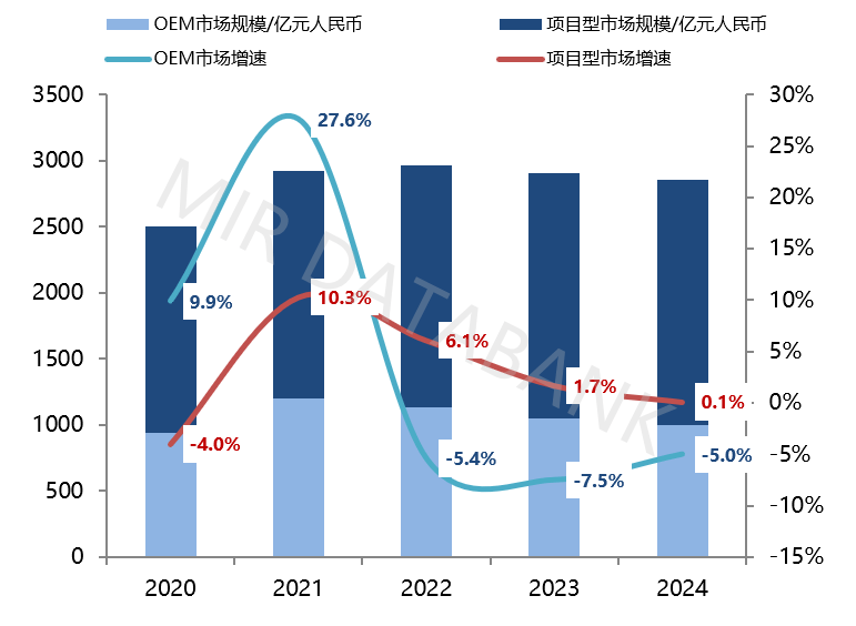 按照MIR DATABANK数据表白Q?024q中国OEM从动化市(jng)模约?000亿元Q同比下?%Q且?jng)场曄持?hu)三年呈现负增加态势Q?024q中国项目型从动化市(jng)模近2000亿元Q同比增??%Q且?jng)场曄持?hu)四年呈现增速放~态势?/p>
